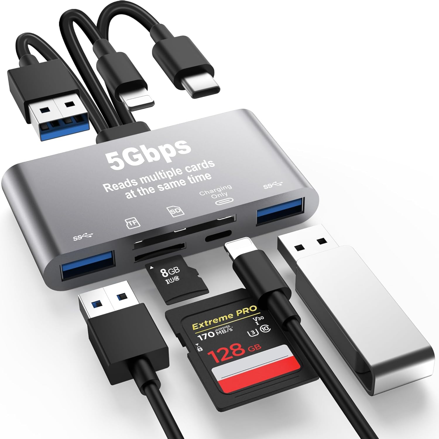 The SD/TF card reader USB adapter supports standard photo formats, including JPER and RAW, as well as SD, HD video formats, and supports all i - OS devices with i - OS 13 and above and OTG Android phone/computer and other devices with USB port, The micro sd card reader supports up to 1TB memory cards and 512GB USB2.0 flash drives, the USB3.0 flash drives cannot exceed 128GB.