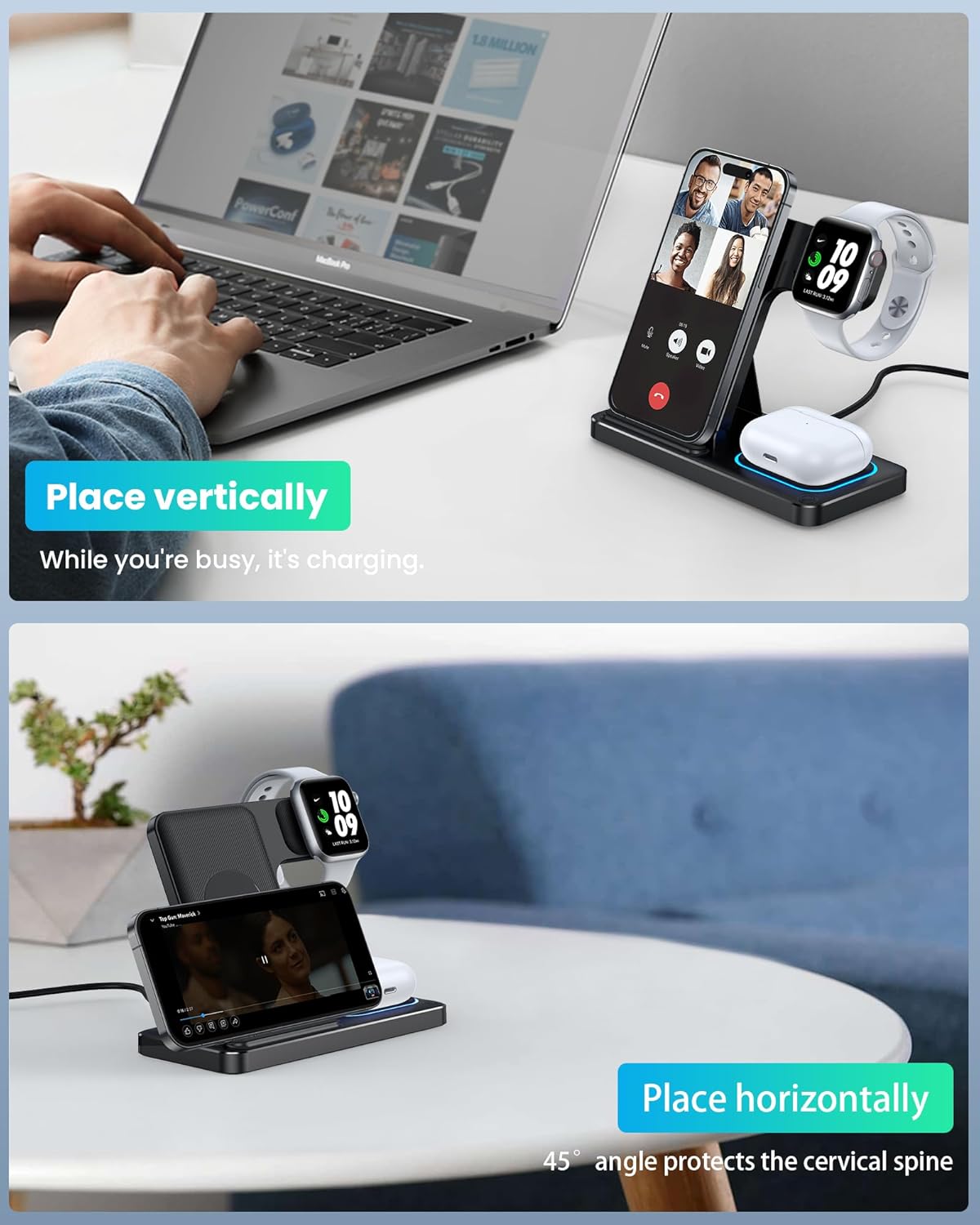 3 in 1 Wireless Charger for iPhone 16/15/14/13/12,Wireless Charging Station for Apple Devices, Charging Stand for Apple Watch Series 10, for AirPods 4 (Black)